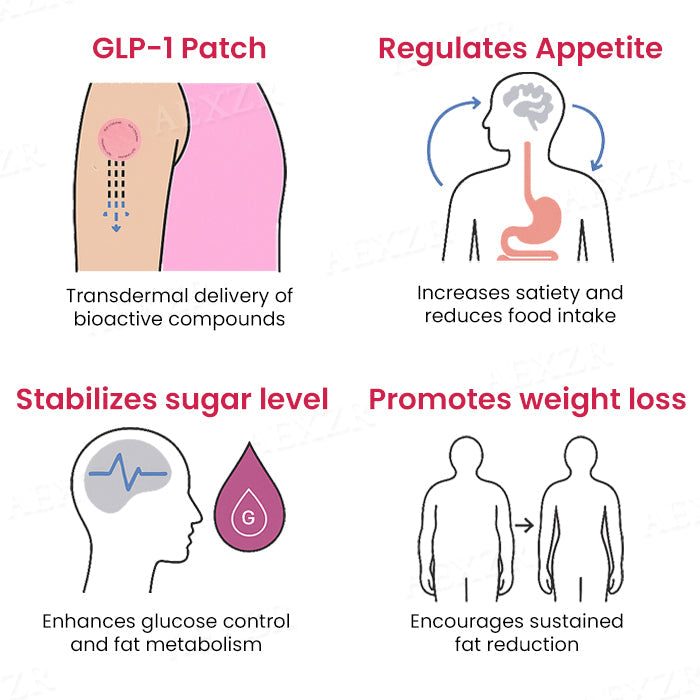 Once absorbed, the compounds help enhance satiety signaling to the brain, reduce food intake, and stabilize blood glucose levels. This results in a natural suppression of appetite, reduced cravings, and improved fat metabolism. With consistent use, the patch promotes sustained weight loss and metabolic balance, all without invasive procedures or extreme dieting
