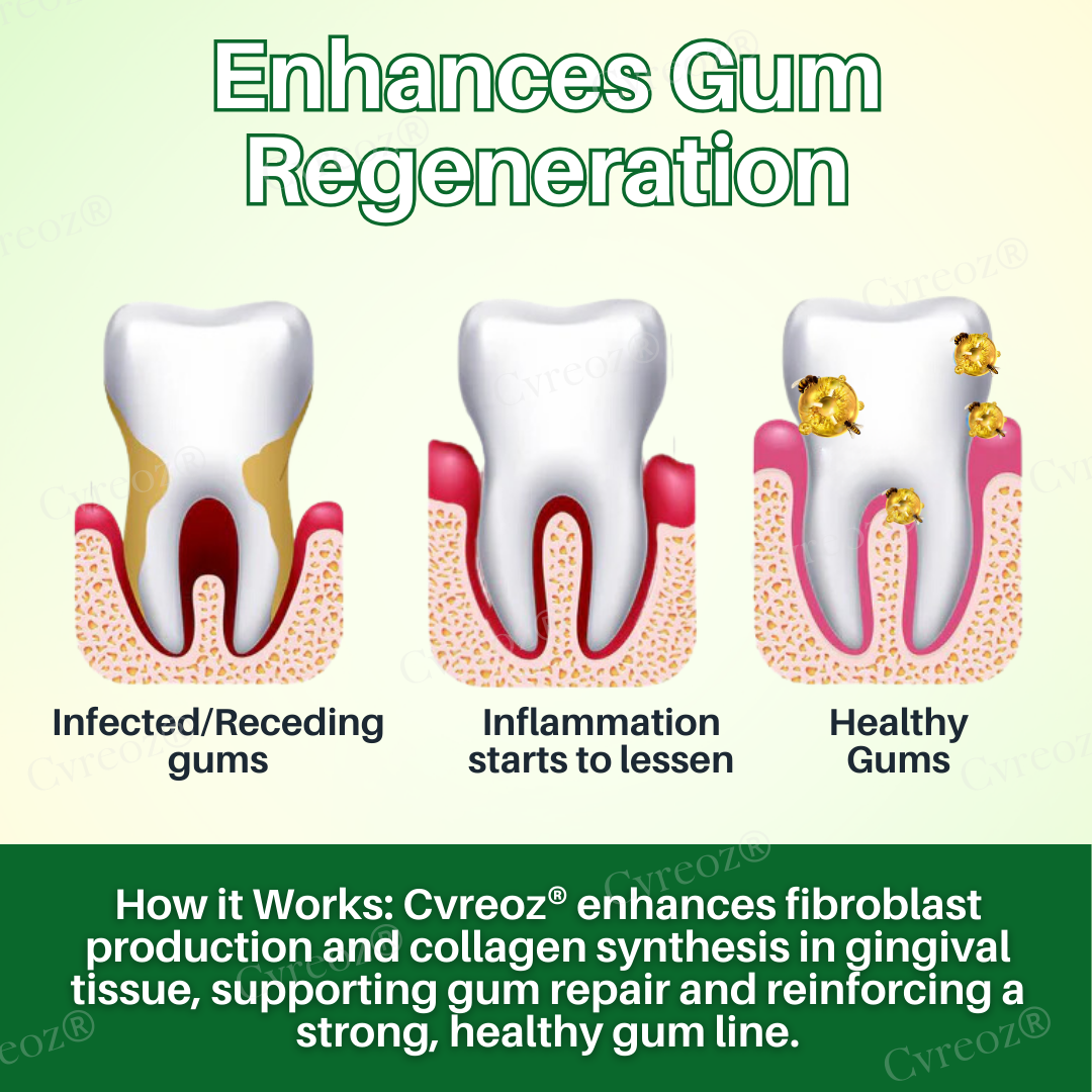 Beyond its gum-healing properties, Cvreoz® enhances overall oral wellness by improving gum attachment and preventing further tissue loss. It boosts collagen production, which plays a crucial role in maintaining gum elasticity and firmness, ensuring a secure hold on teeth and reducing the risk of loose teeth or tooth loss. Additionally, by strengthening gum tissue, Cvreoz® minimizes tooth sensitivity and enhances long-term oral health. Incorporating Cvreoz® into your daily routine means taking proactive care of your gums, ensuring lasting protection, stronger teeth, and a more confident, pain-free smile. Whether you're looking to reverse gum damage, prevent future problems, or simply maintain optimal gum health, Cvreoz® is the natural, effective solution you can trust.