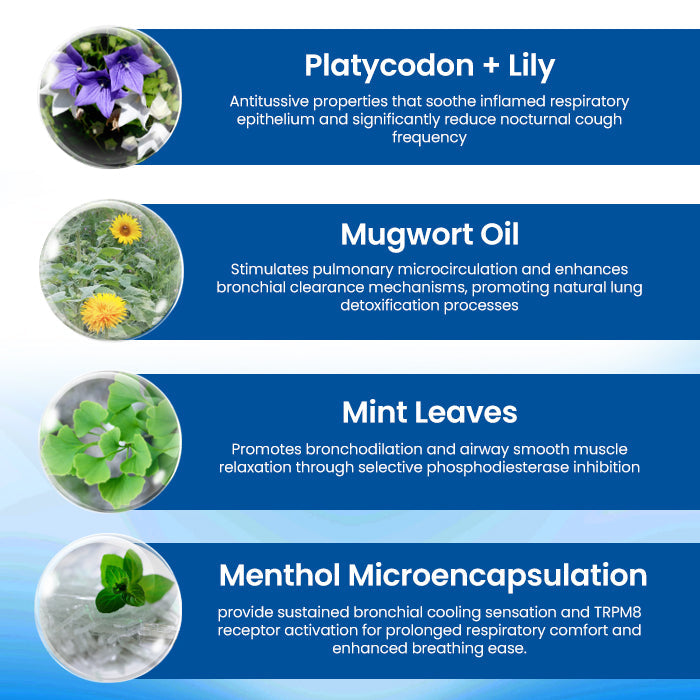 Time-released menthol microcapsules provide sustained bronchial cooling sensation and TRPM8 receptor activation for prolonged respiratory comfort and enhanced breathing ease.