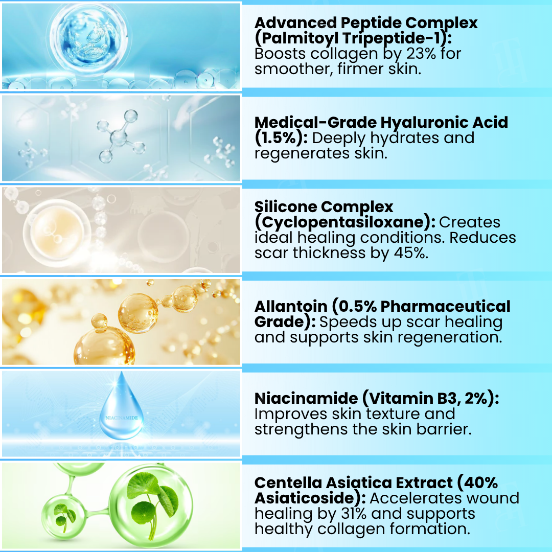 From Texture Normalization (Weeks 4–8) to Long-Term Protection (ongoing), skin gradually renews and smooths out, supported by a breathable, non-greasy barrier that helps prevent future scars while preserving hydration, elasticity, and clarity.
